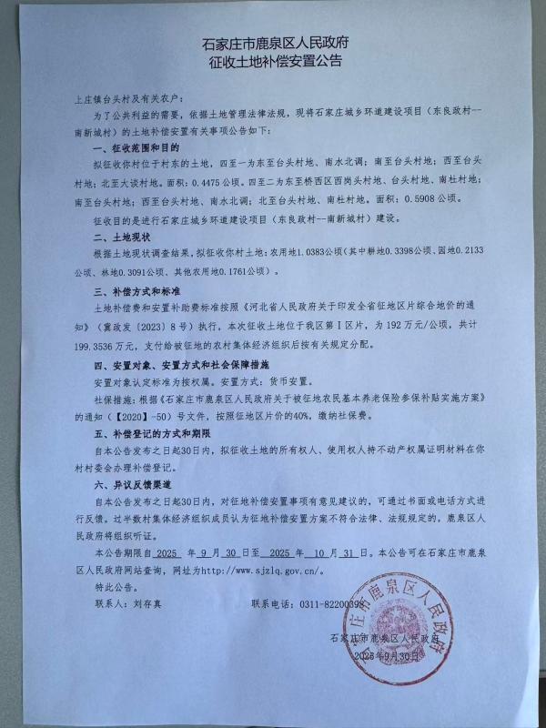 石家庄市鹿泉区人民政府征收土地补偿安置公告(上庄镇台头村)