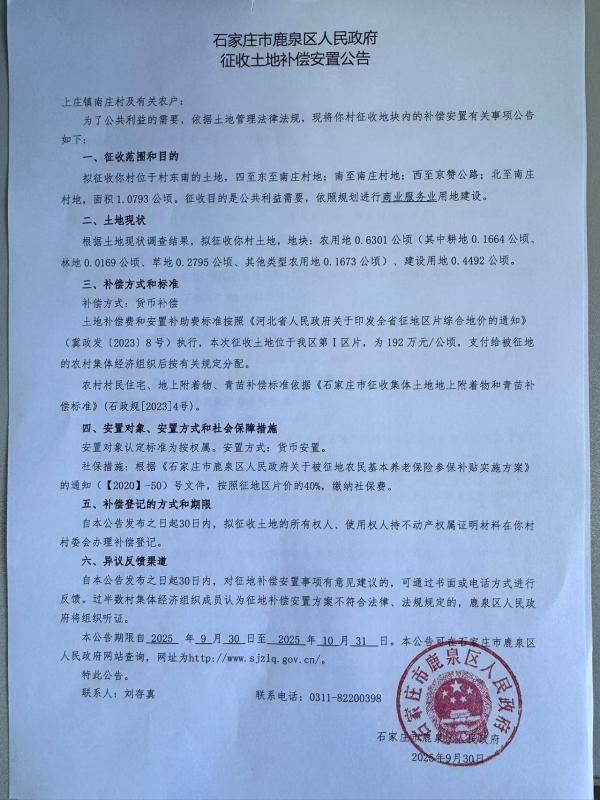 石家庄市鹿泉区人民政府征收土地补偿安置公告(上庄镇南庄村)