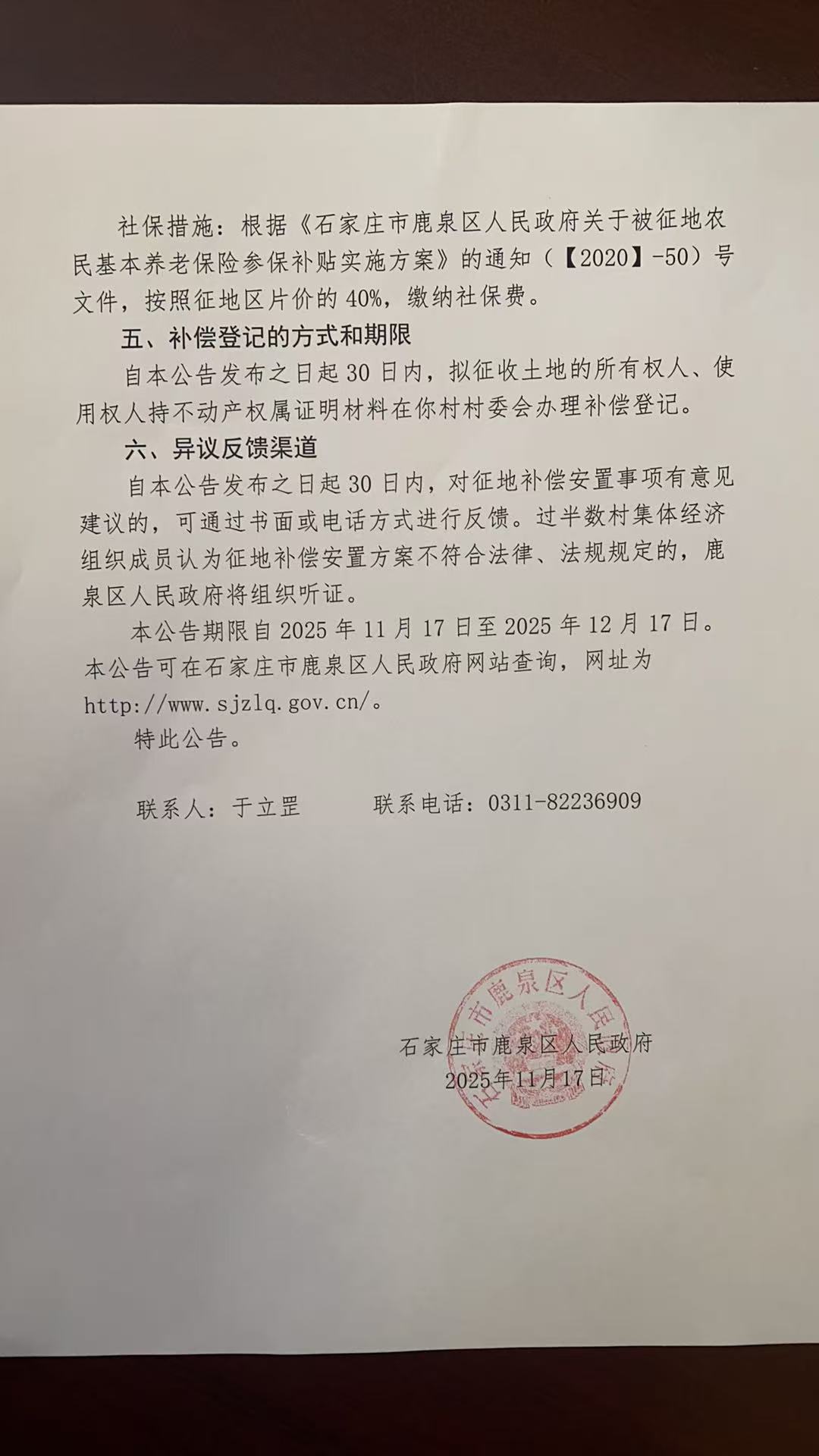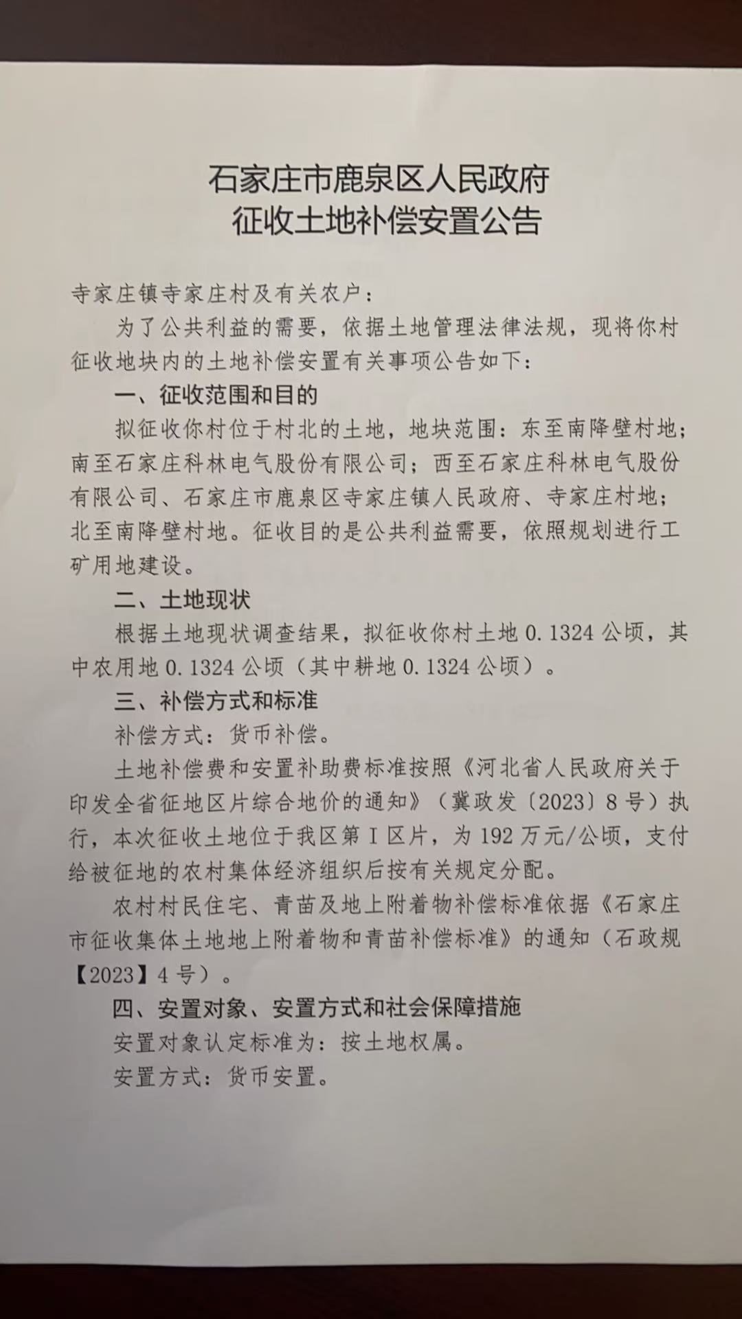 石家庄市鹿泉区人民政府征收土地补偿安置公告(寺家庄镇寺家庄村)