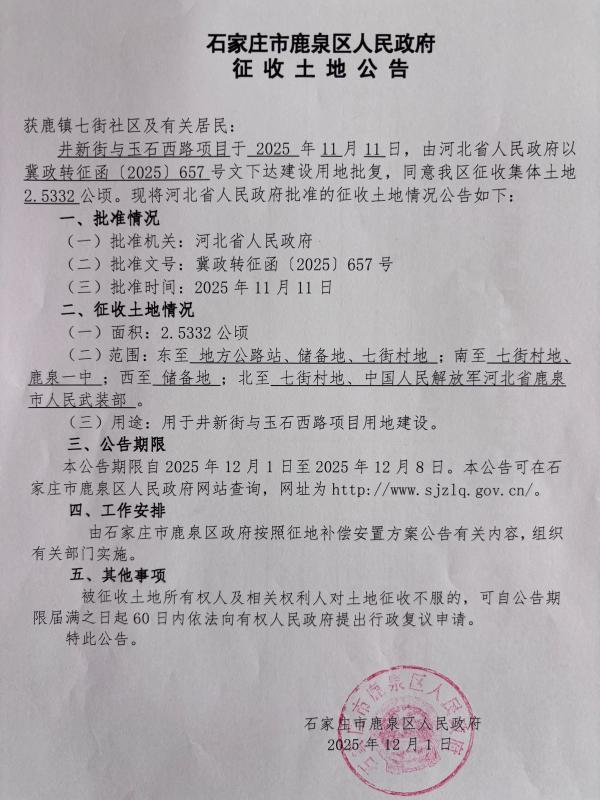 石家庄市鹿泉区人民政府征收土地公告(获鹿镇七街社区)