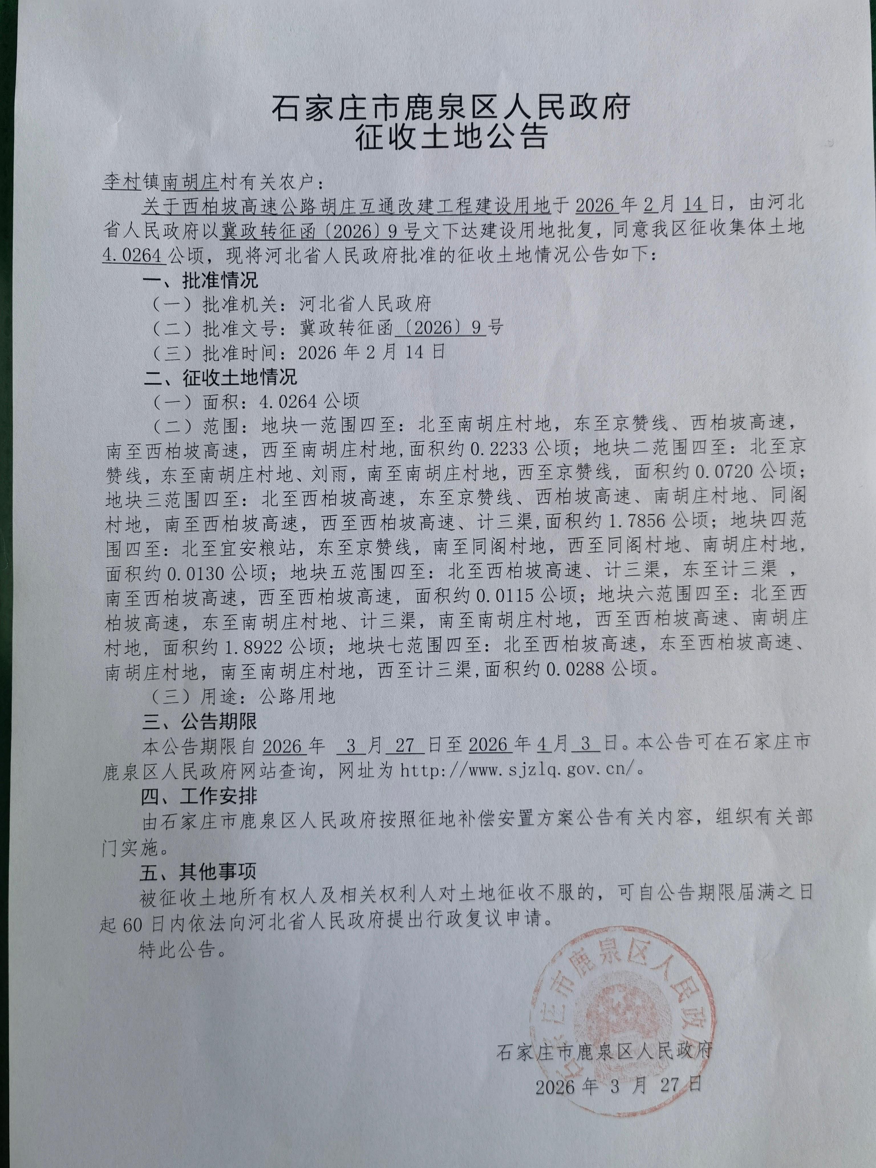 石家庄市鹿泉区人民政府征收土地公告(李村镇南胡庄村)
