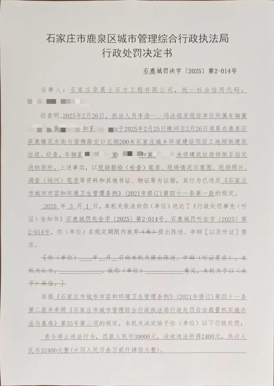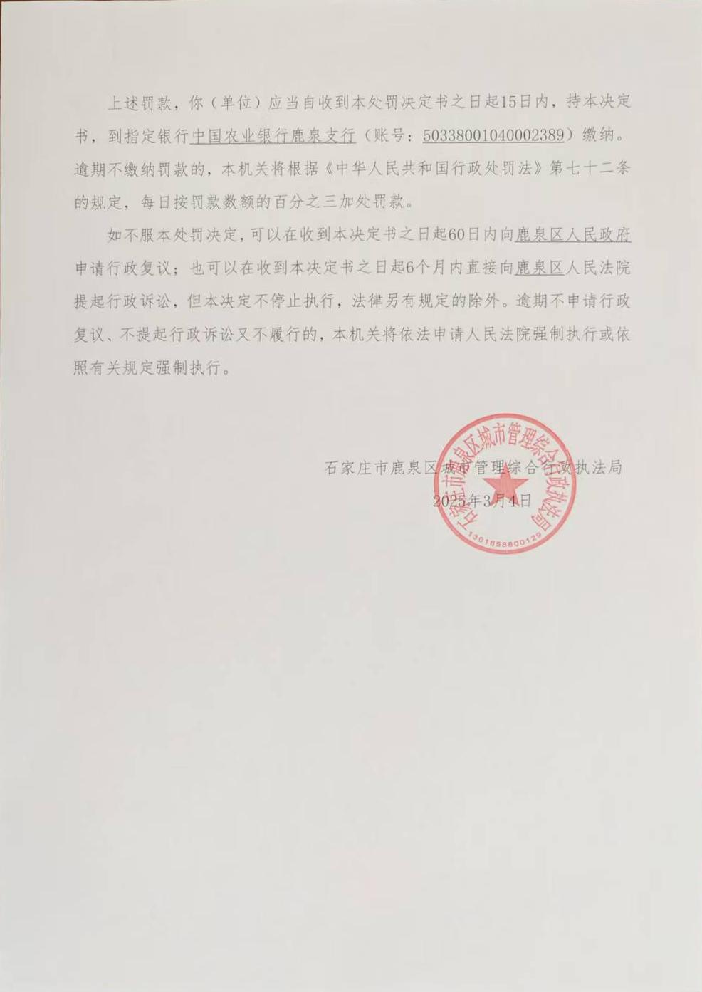 石家庄市鹿泉区城市管理综合行政执法局2025年度行政处罚公示2-014