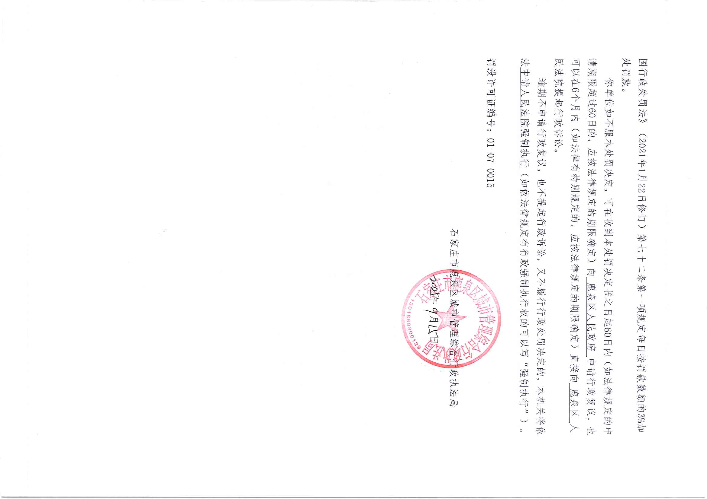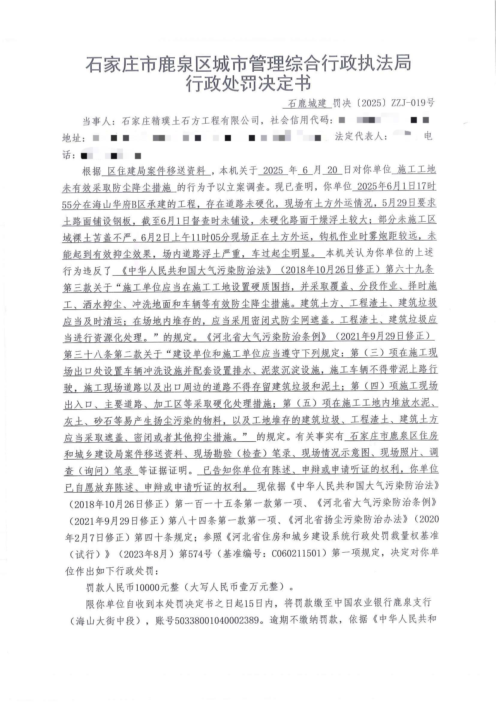 石家庄市鹿泉区城市管理综合行政执法局2025年度行政处罚公示ZZJ-019