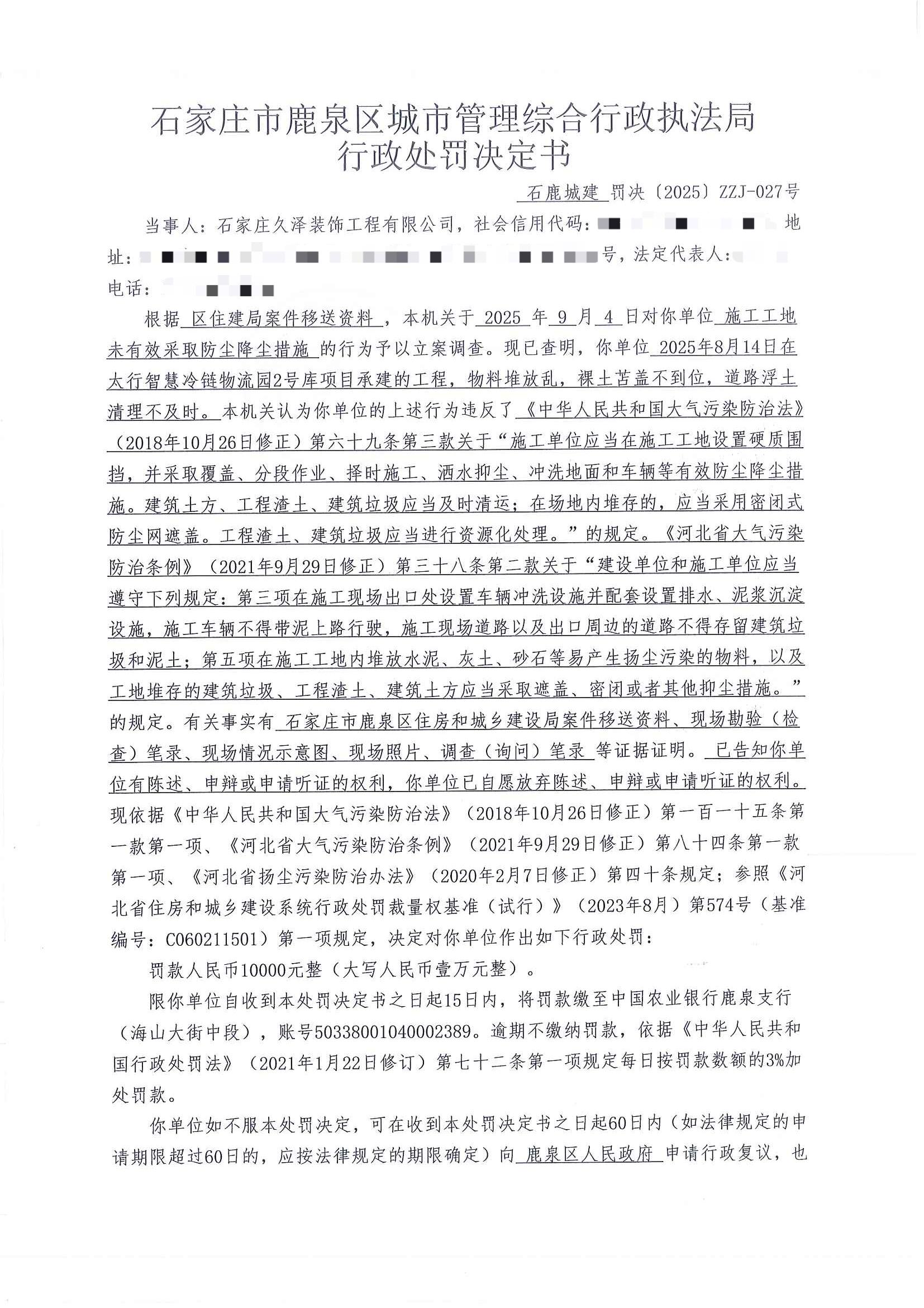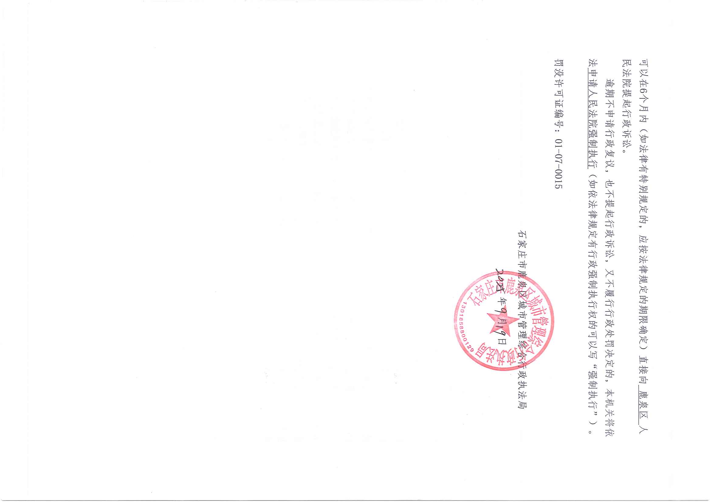 石家庄市鹿泉区城市管理综合行政执法局2025年度行政处罚公示ZZJ-027