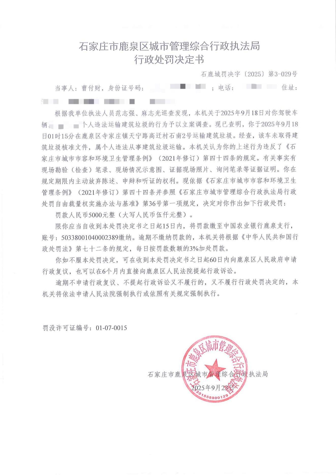 石家庄市鹿泉区城市管理综合行政执法局2025年度行政处罚公示3-029