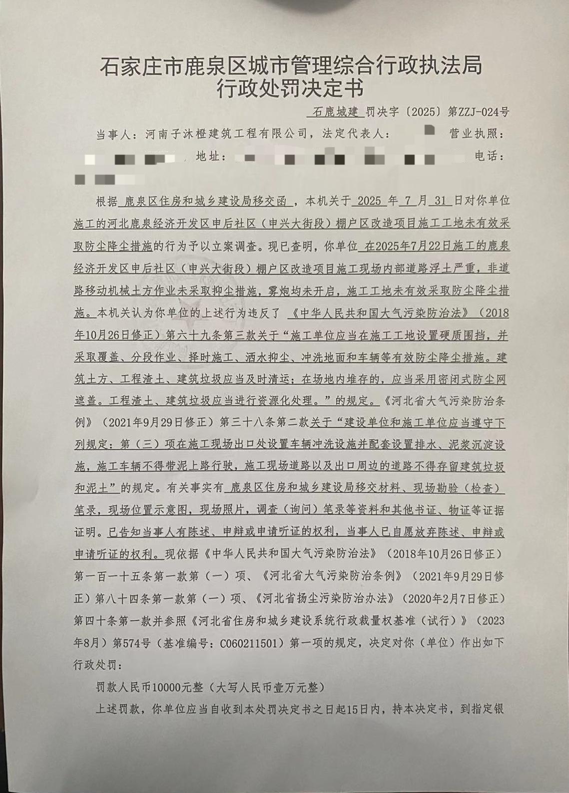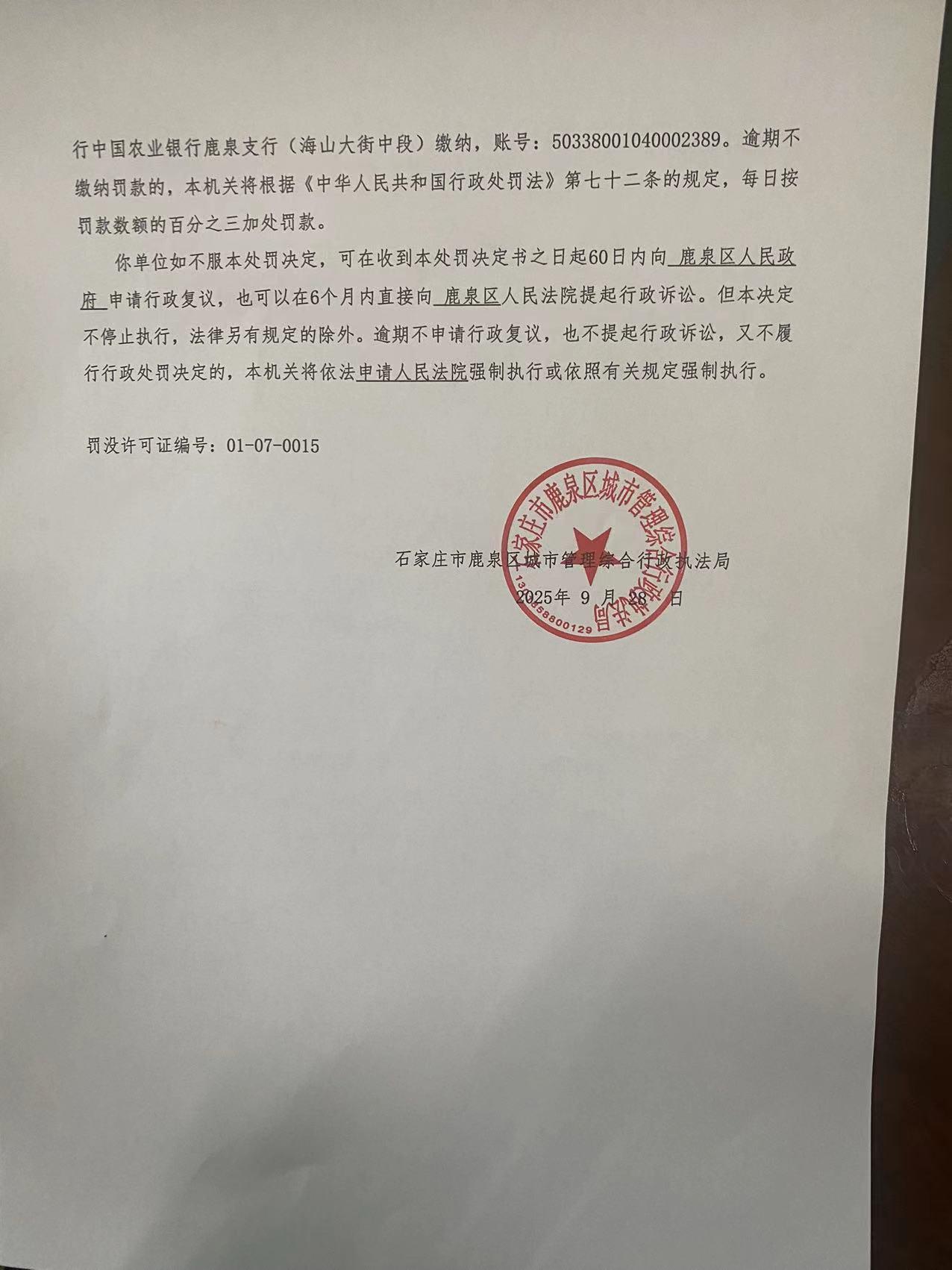 石家庄市鹿泉区城市管理综合行政执法局2025年度行政处罚公示ZZJ-024