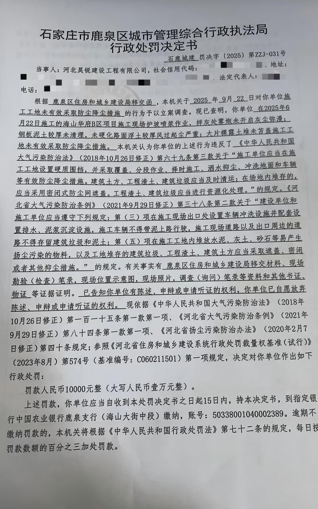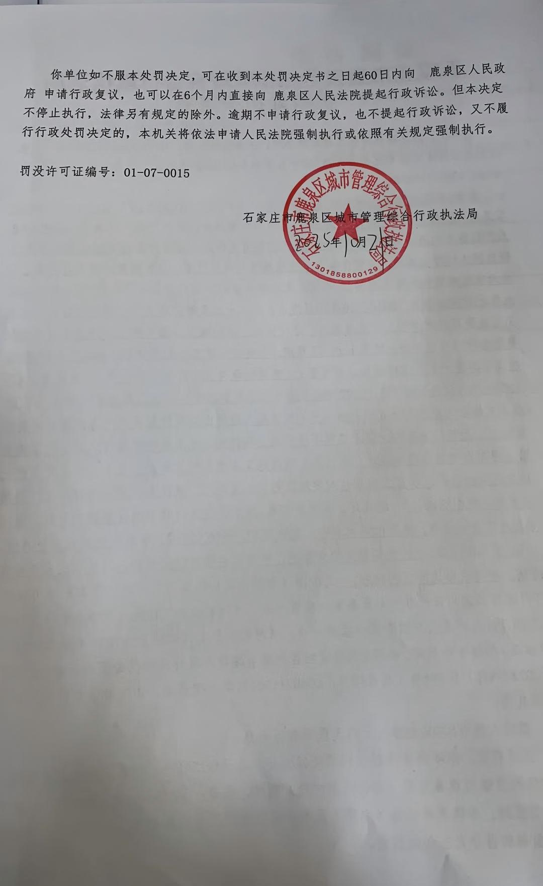 石家庄市鹿泉区城市管理综合行政执法局2025年度行政处罚公示ZZJ-031