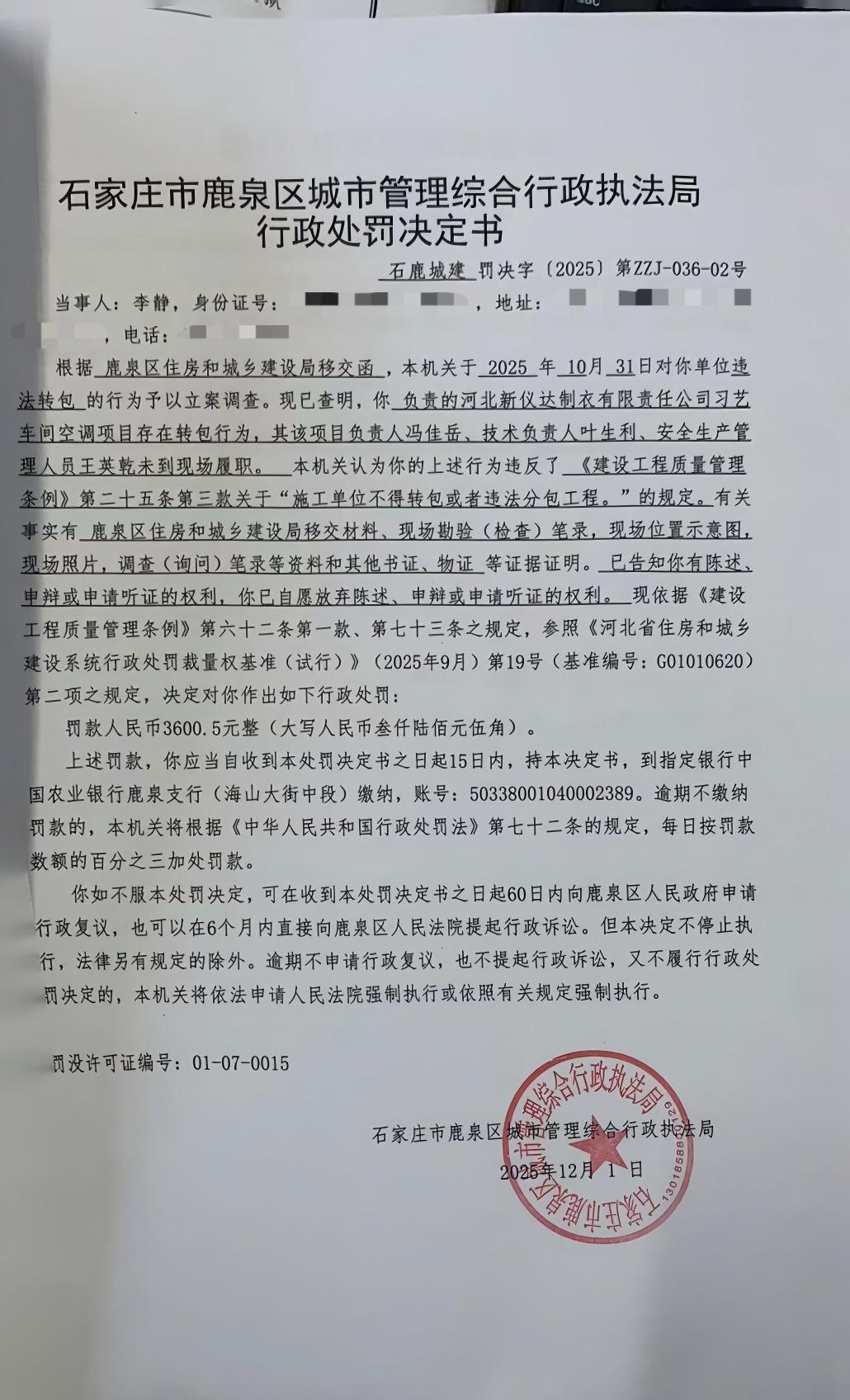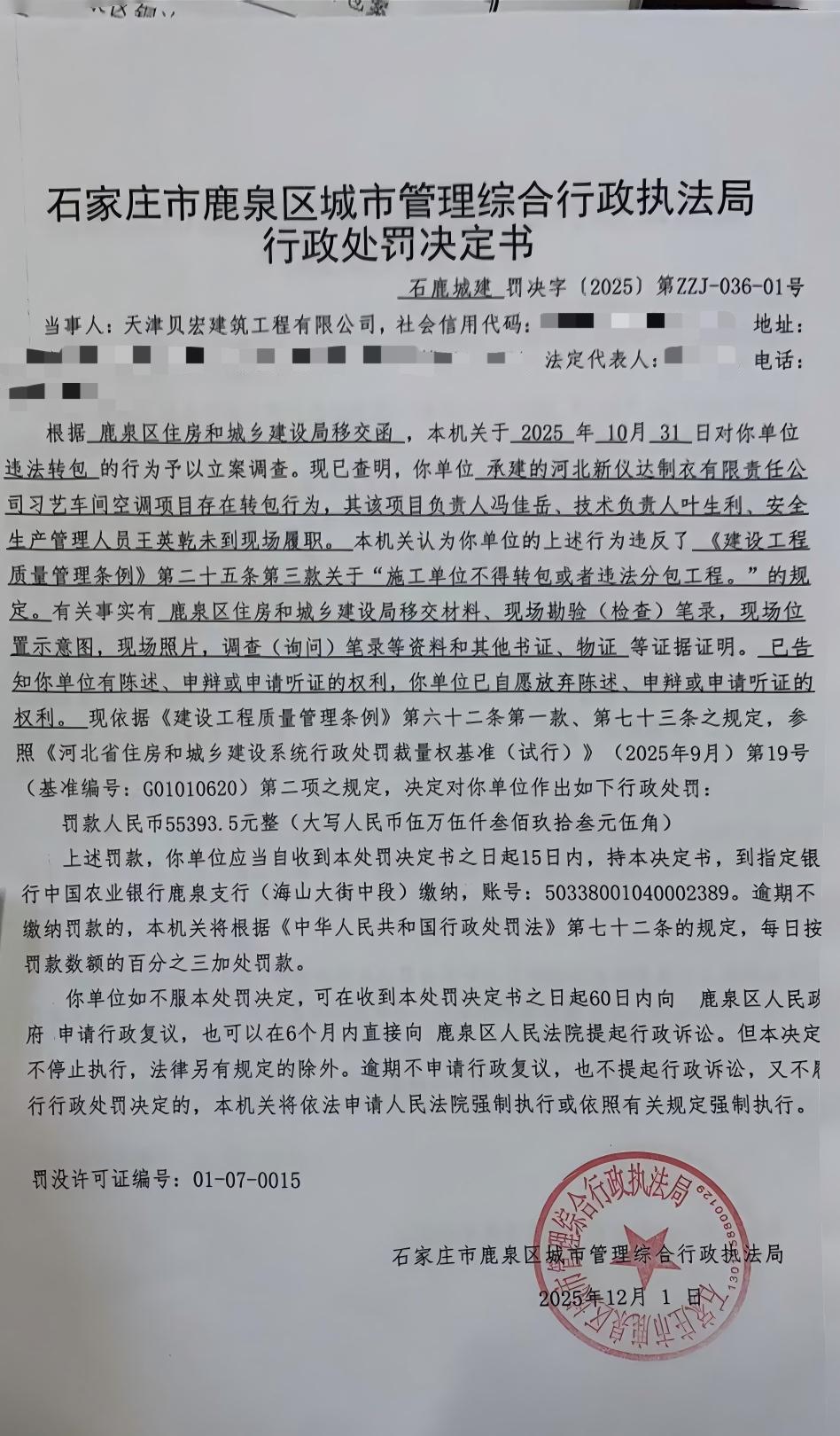 石家庄市鹿泉区城市管理综合行政执法局2025年度行政处罚公示ZZJ-036