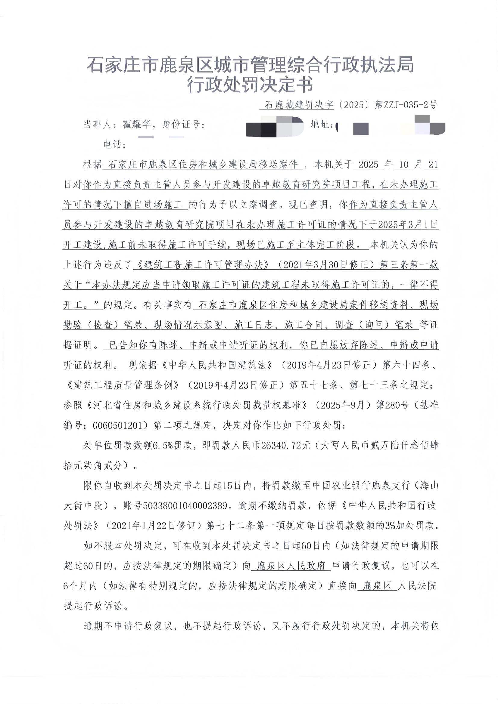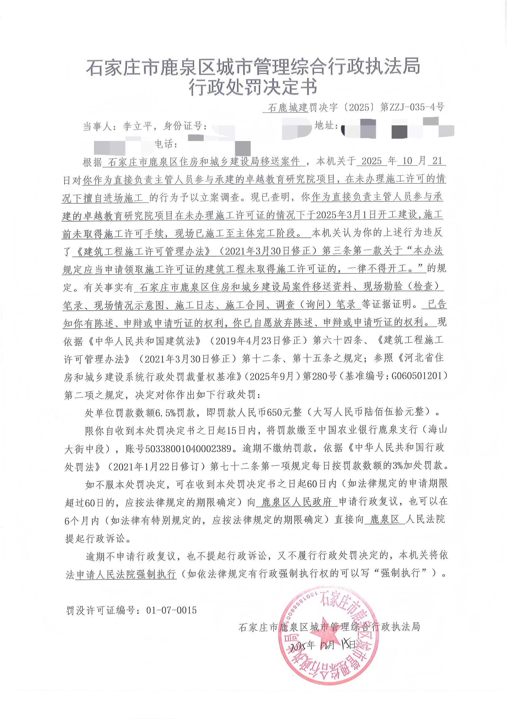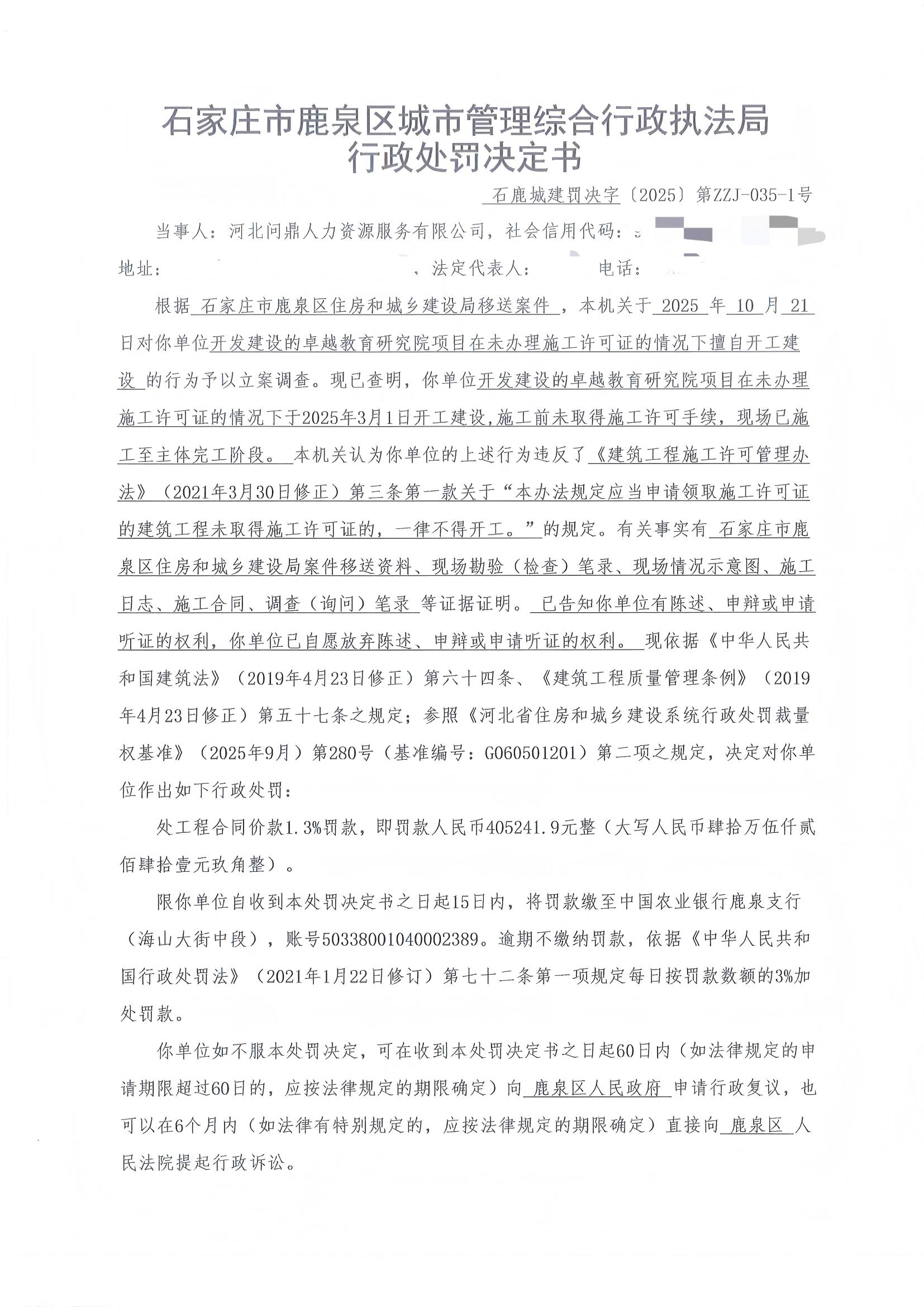 石家庄市鹿泉区城市管理综合行政执法局2025年度行政处罚公示ZZJ-035