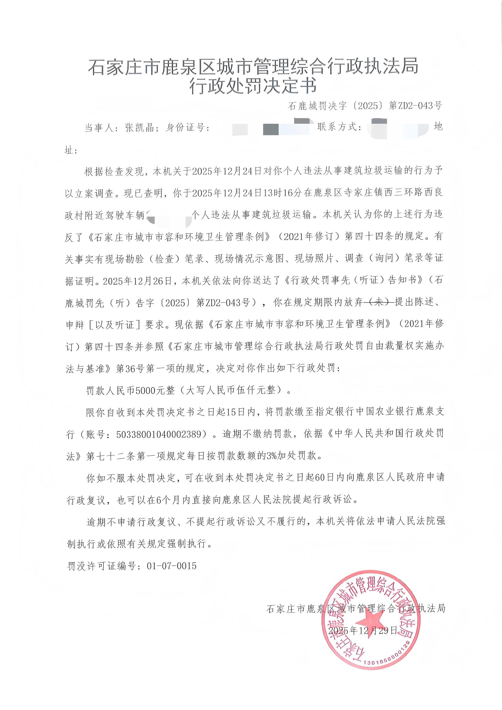 石家庄市鹿泉区城市管理综合行政执法局2025年度行政处罚公示ZD2-043