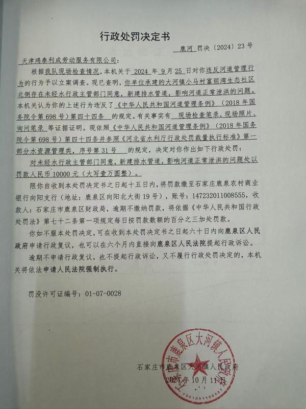 天津鸿泰利成劳动服务有限公司违反河道管理行为案