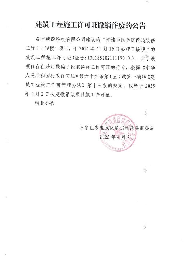 建筑工程施工许可证撤销作废的公告