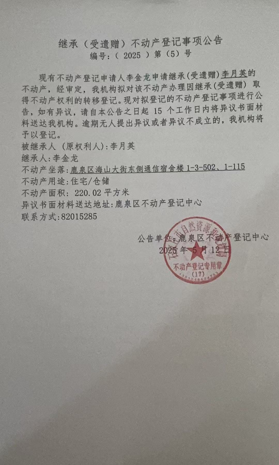继承(受遗赠)不动产登记事项公告(2025)第(5)号