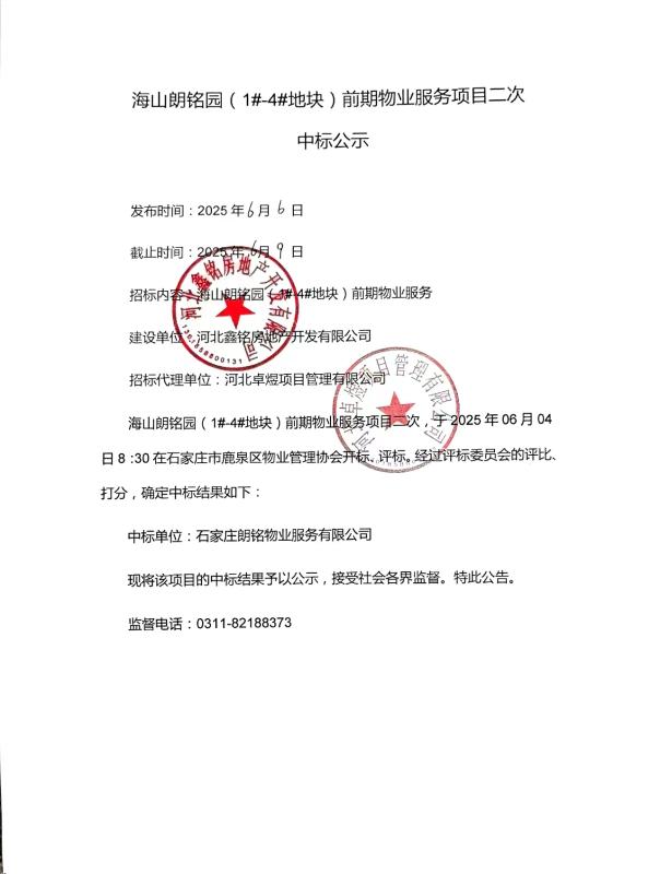海山朗铭园(1#-4#地块)前期物业服务项目二次中标公示