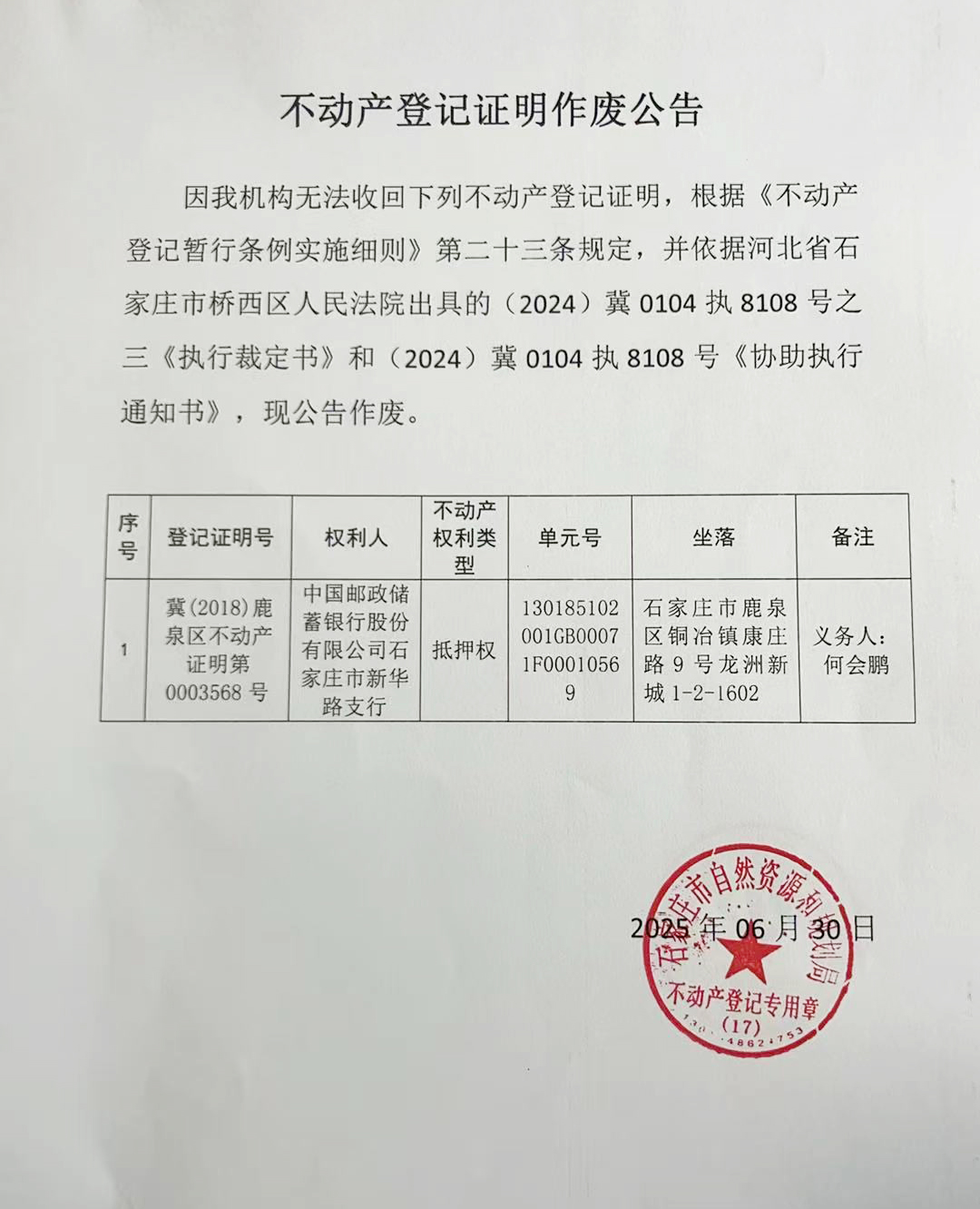 不动产登记证明作废公告(何会鹏)