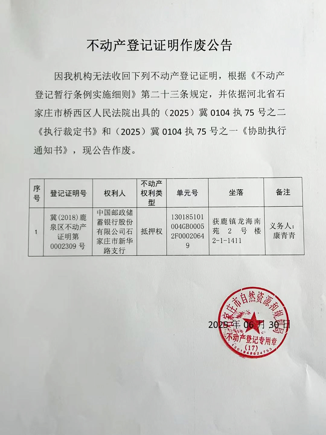不动产登记证明作废公告(康青青)