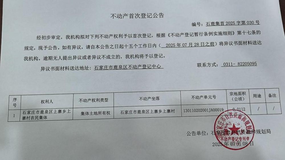 不动产首次登记公告(石鹿集首2025字第030号)