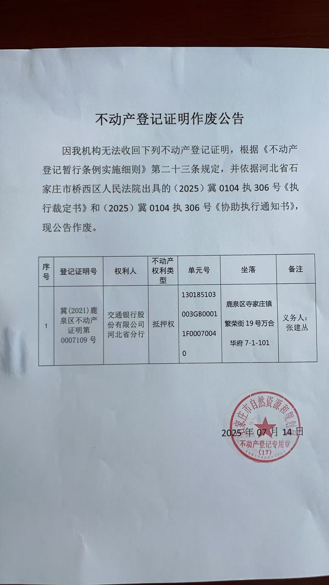 不动产登记证明作废公告(张建丛)