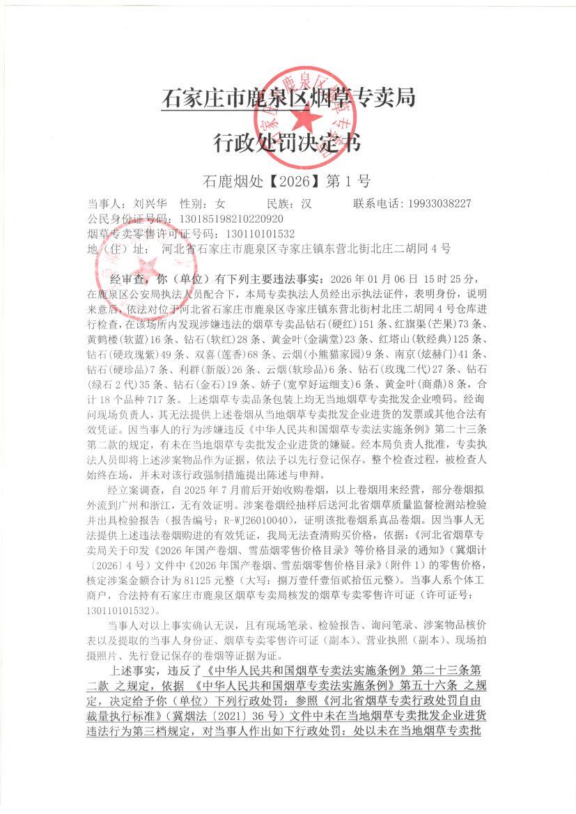 石家庄市鹿泉区烟草专卖局行政处罚决定书