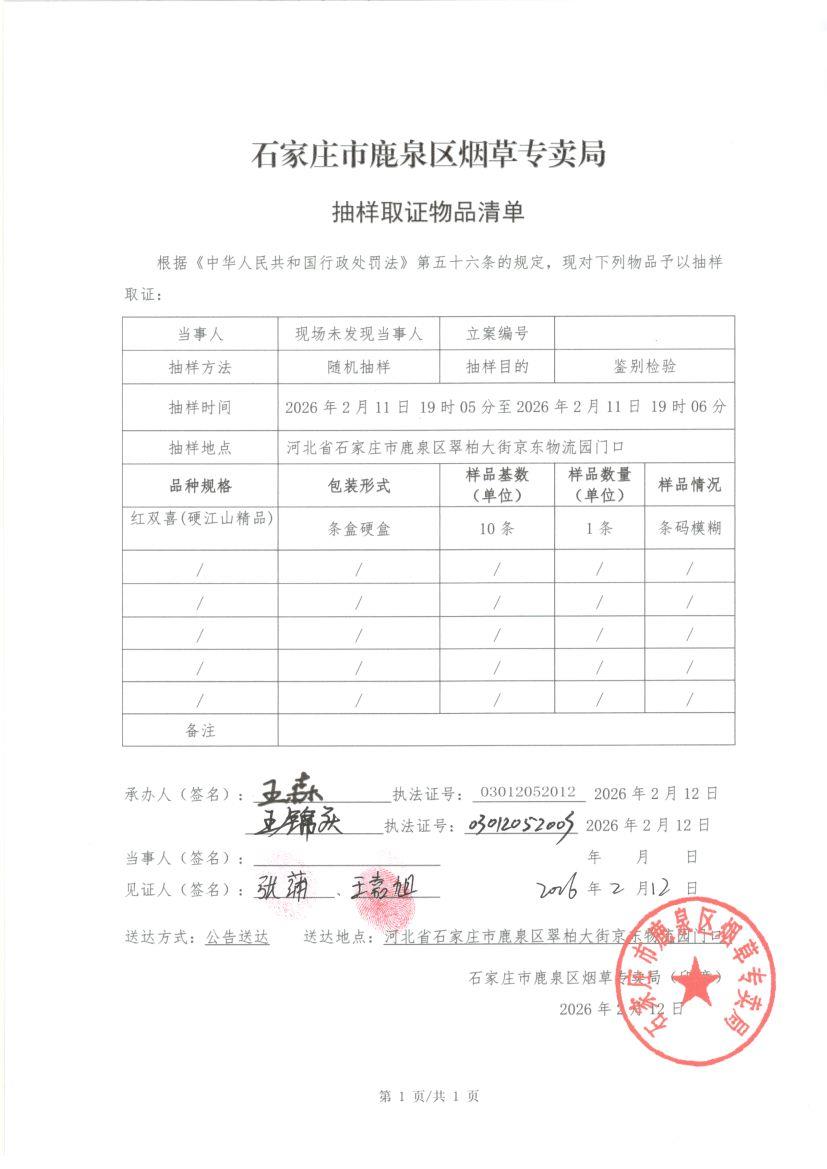 石鹿烟【2026】第13号抽样取证物品清单