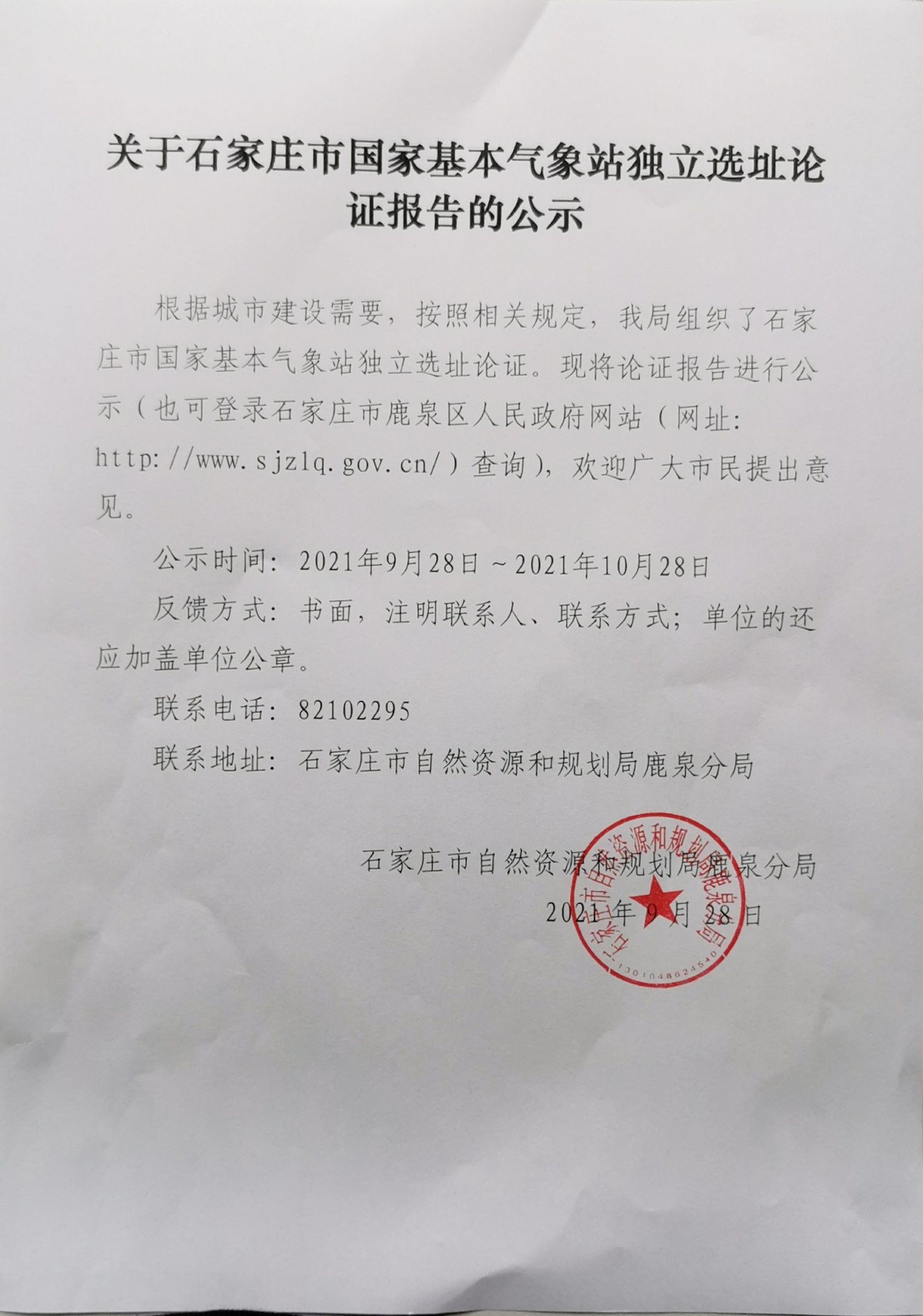 关于石家庄市国家基本气象站独立选址论证报告的公告