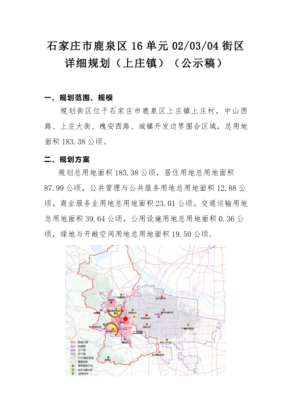 关于石家庄市鹿泉区16单元02/03/04街区详细规划(上庄镇)的公示