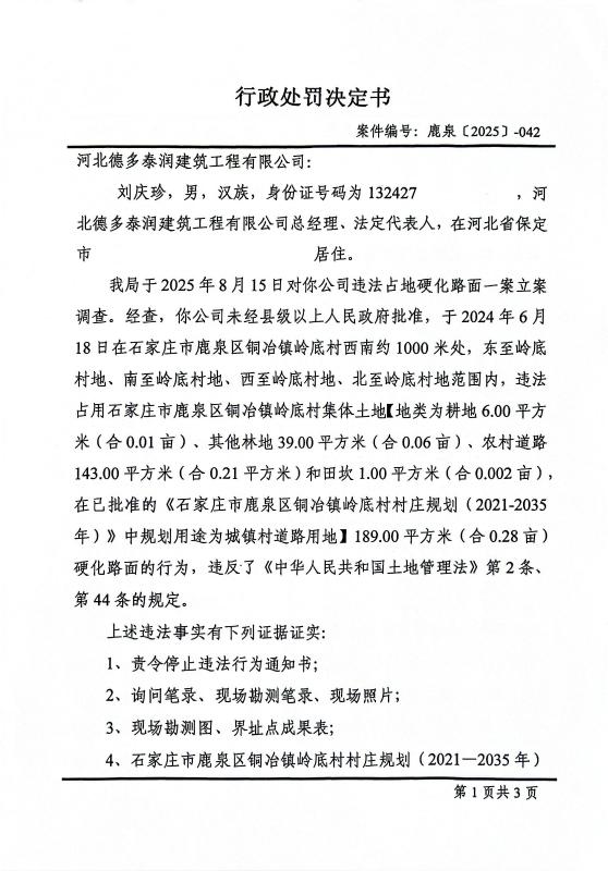 行政处罚决定书鹿泉[2025]-042