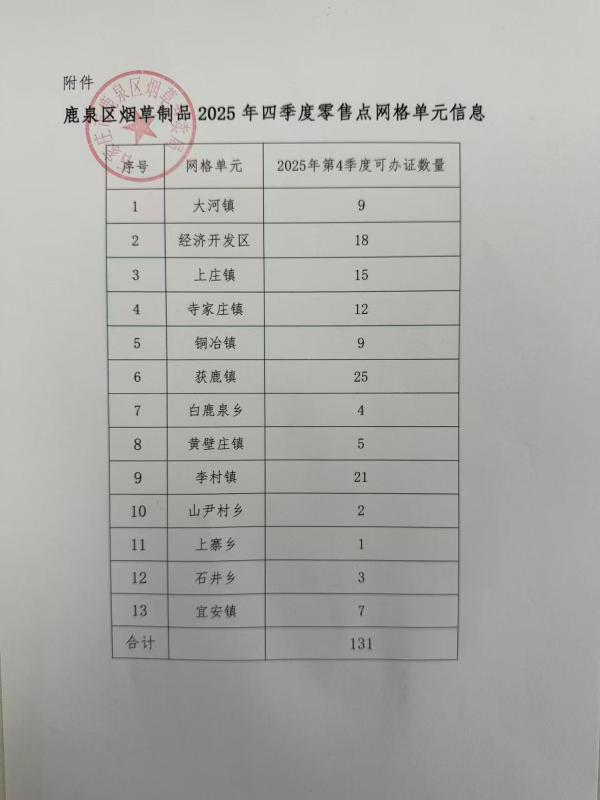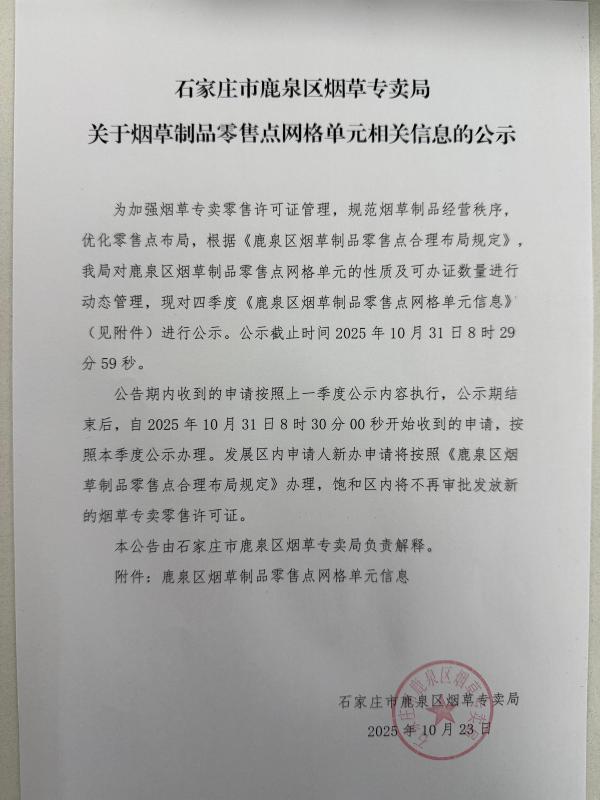 石家庄市鹿泉区烟草专卖局关于第四季度烟草制品零售点网格单元相关信息的公示