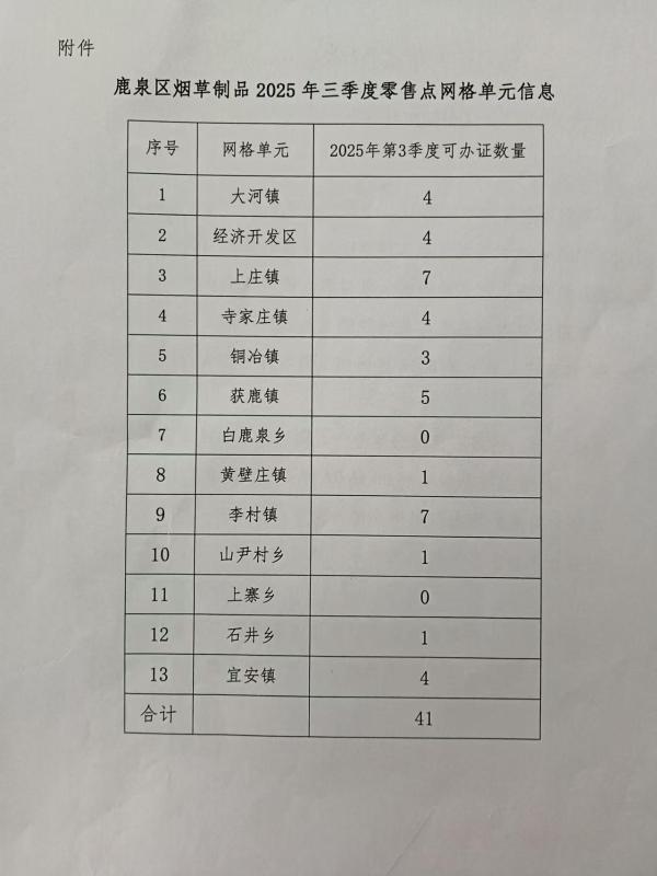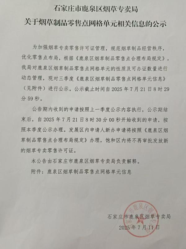 石家庄市鹿泉区烟草专卖局关于第三季度烟草制品零售点网格单元相关信息的公示