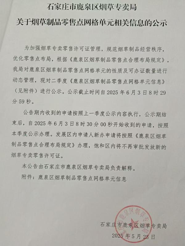 石家庄市鹿泉区烟草专卖局关于第二季度烟草制品零售点网格单元相关信息的公示