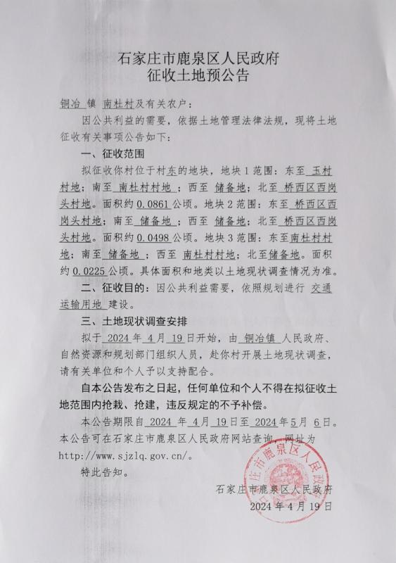 石家庄市鹿泉区人民政府征收土地预公告(铜冶镇南杜村)