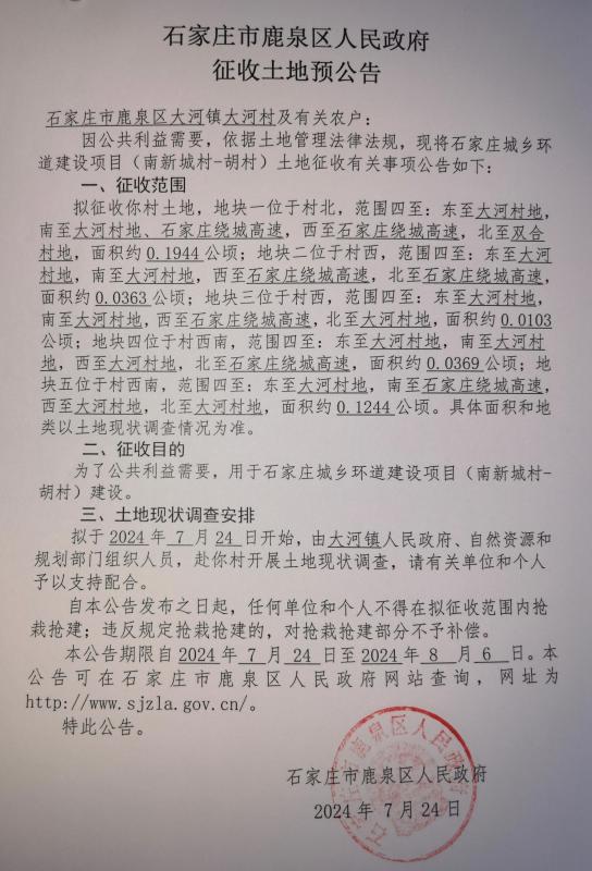 石家庄市鹿泉区人民政府征收土地预公告(鹿泉区大河镇大河村)