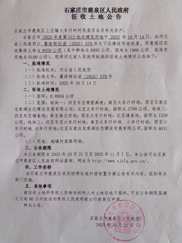 石家庄市鹿泉区人民政府征收土地公告(上庄镇大车行村)