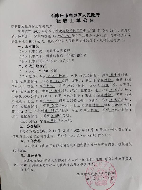 石家庄市鹿泉区人民政府征收土地公告(获鹿镇杜家庄村)