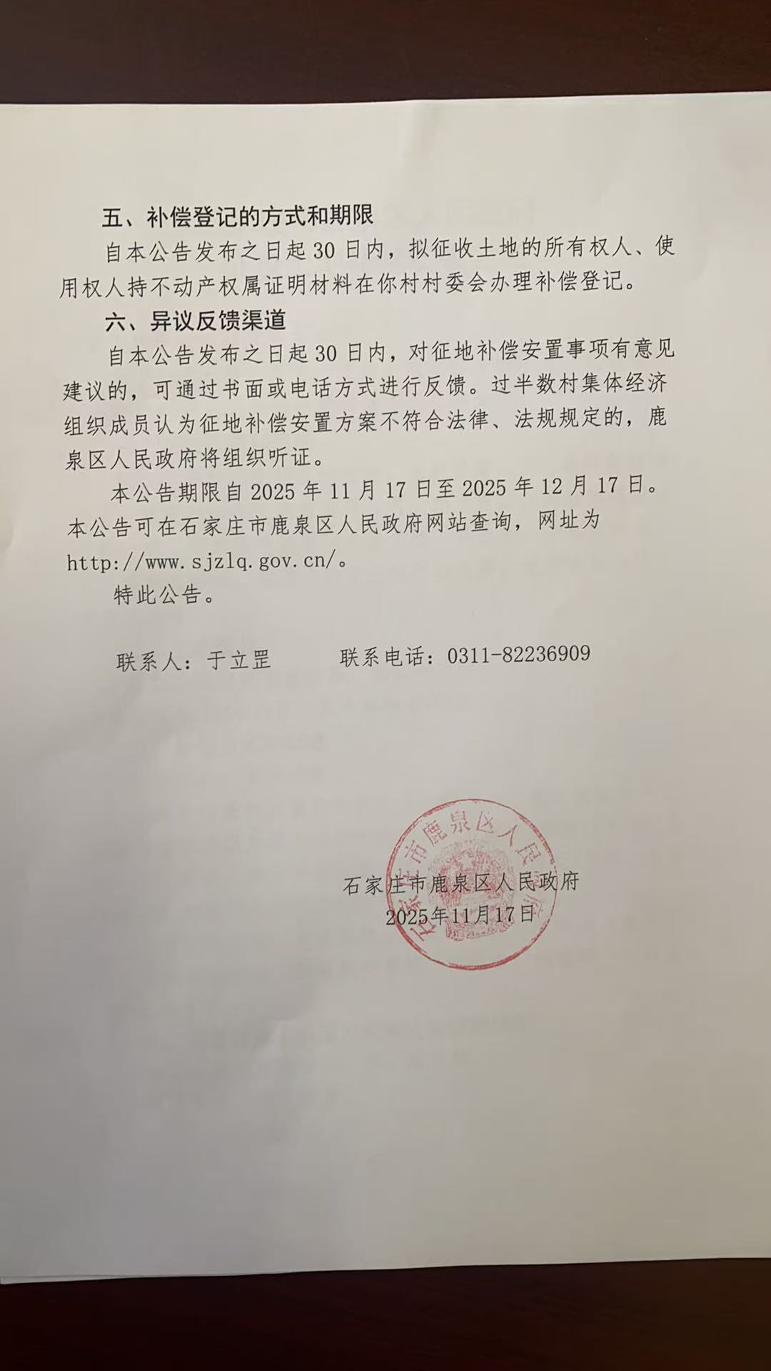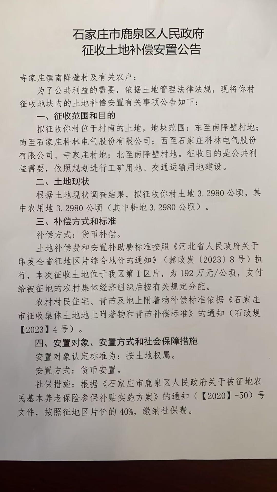 石家庄市鹿泉区人民政府征收土地补偿安置公告(寺家庄镇南降壁村)