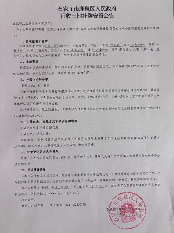 石家庄市鹿泉区人民政府征收土地补偿安置公告(获鹿镇八街社区)