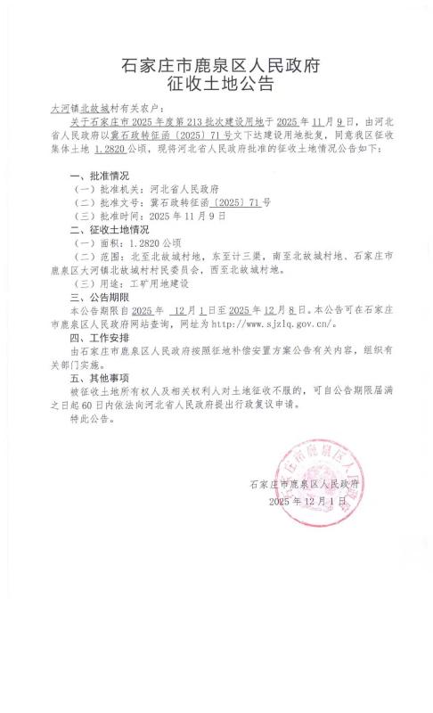 石家庄市鹿泉区人民政府征收土地公告(大河镇北故城村)