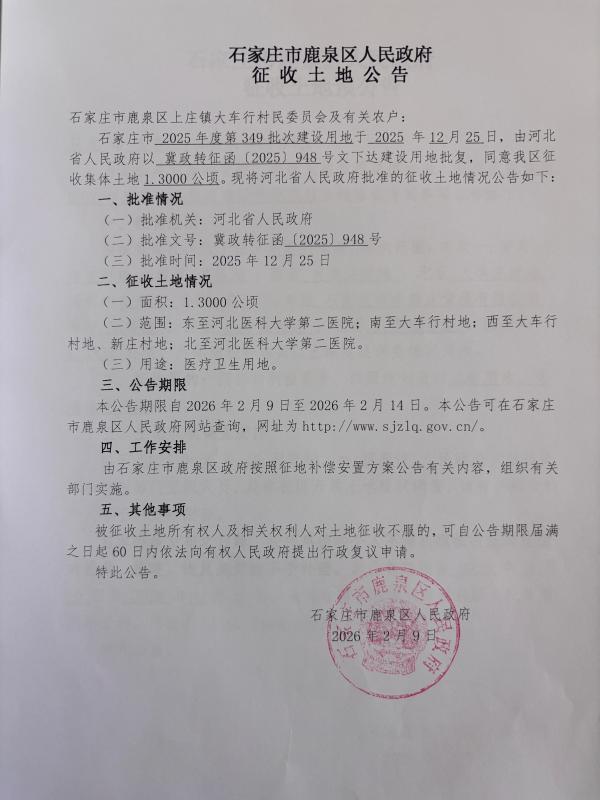 石家庄市鹿泉区人民政府征收土地公告(上庄镇大车行村)