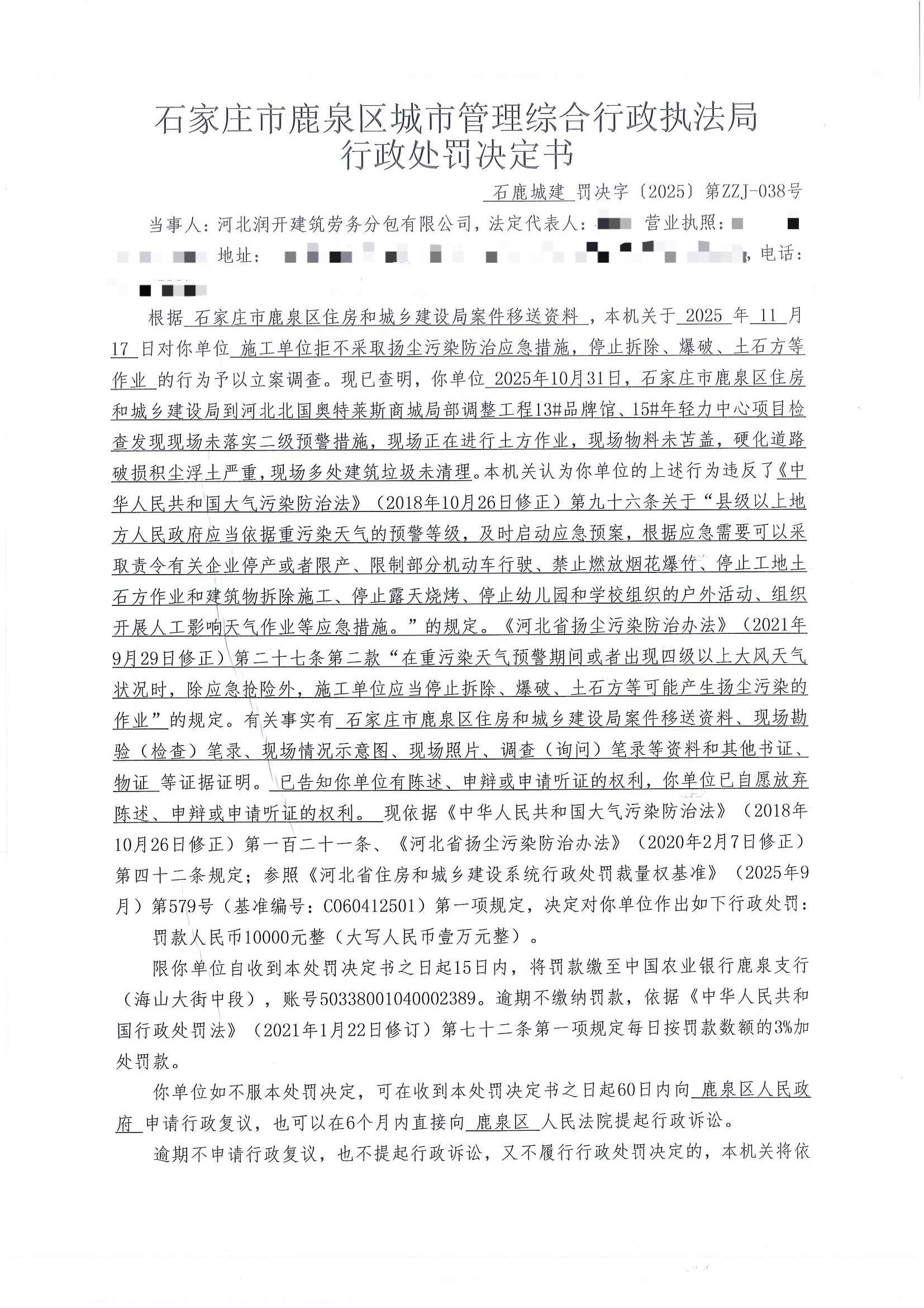 石家庄市鹿泉区城市管理综合行政执法局2025年度行政处罚公示ZZJ-038