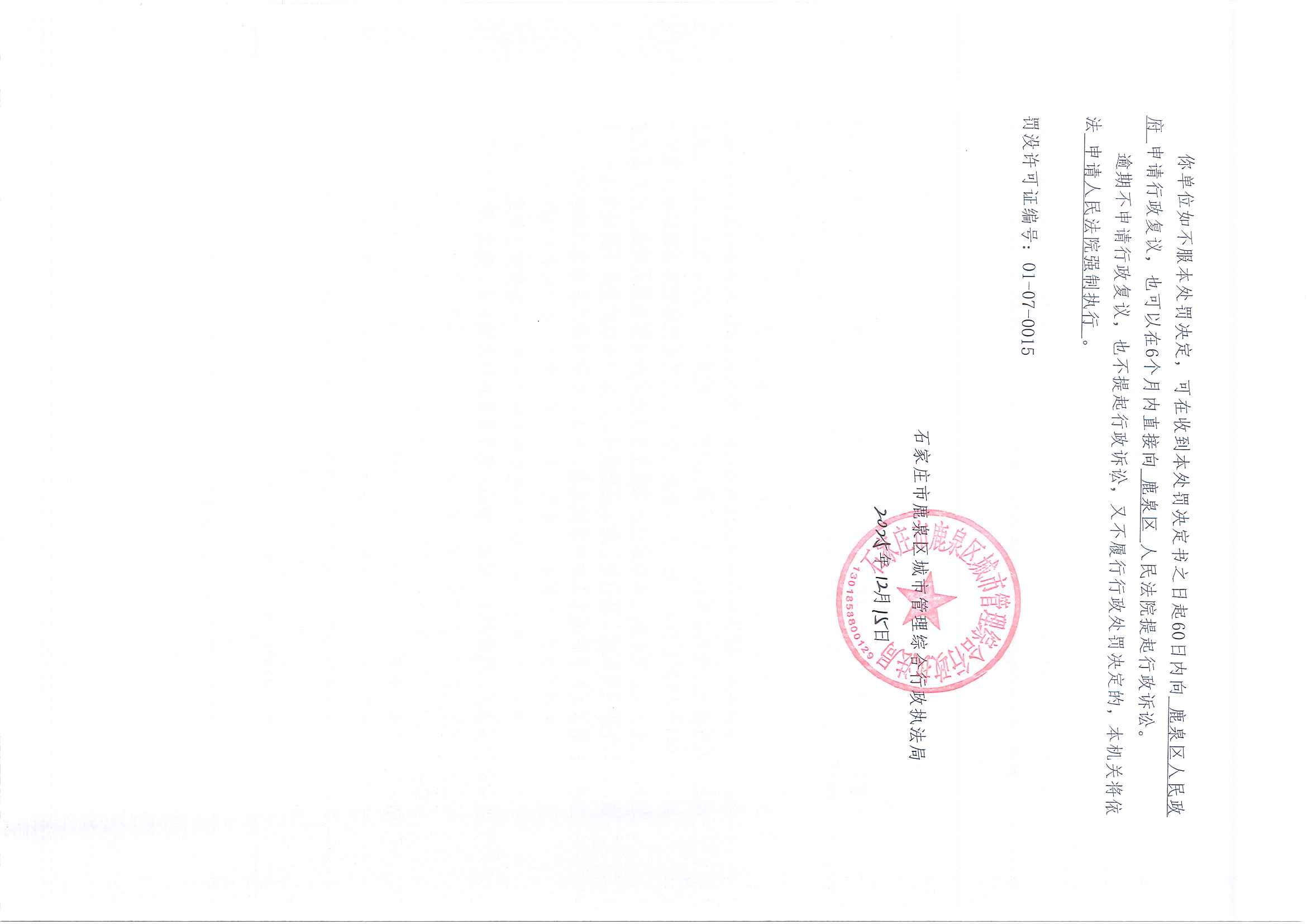 石家庄市鹿泉区城市管理综合行政执法局2025年度行政处罚公示ZZJ-033