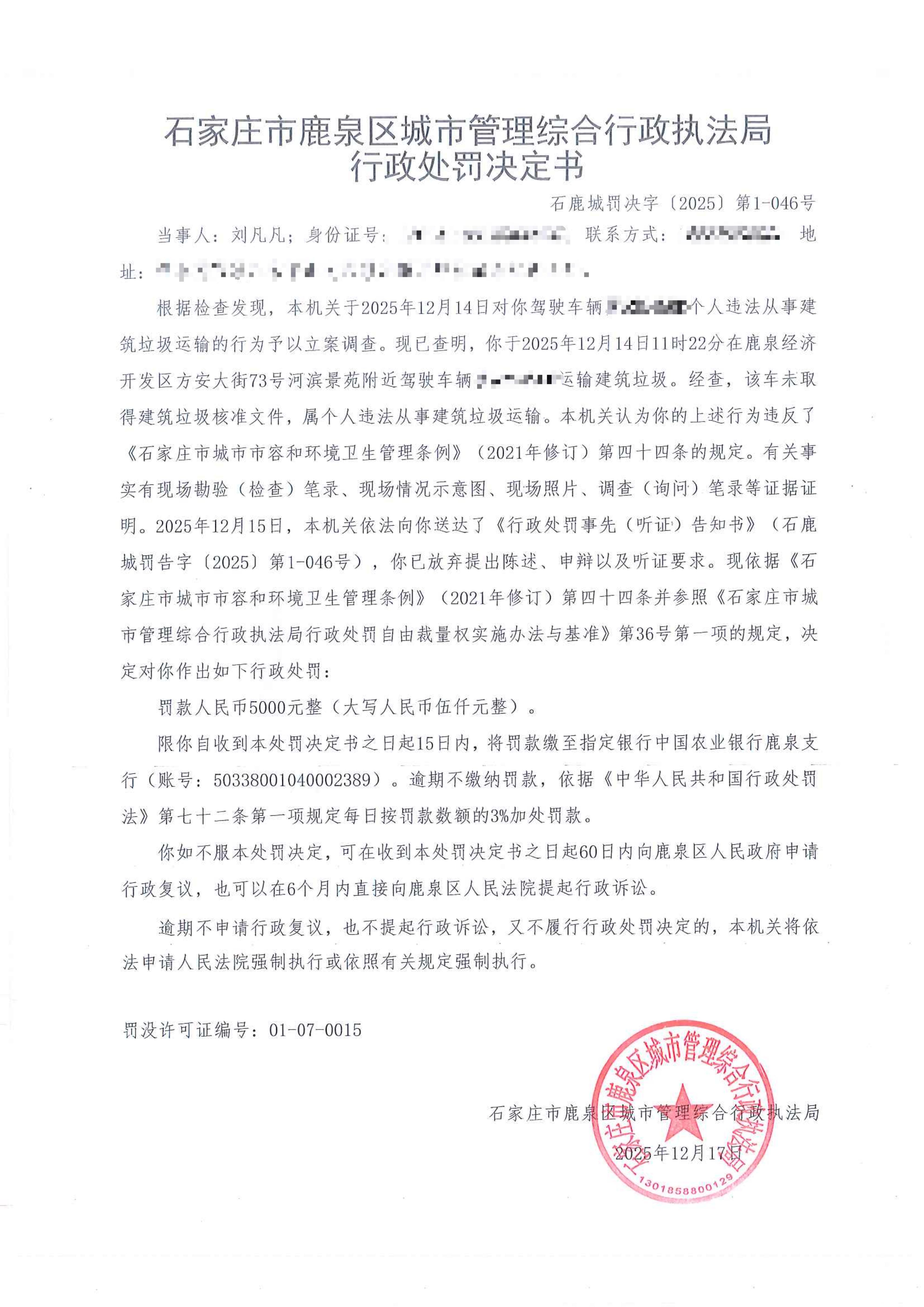 石家庄市鹿泉区城市管理综合行政执法局2025年度行政处罚公示1-046