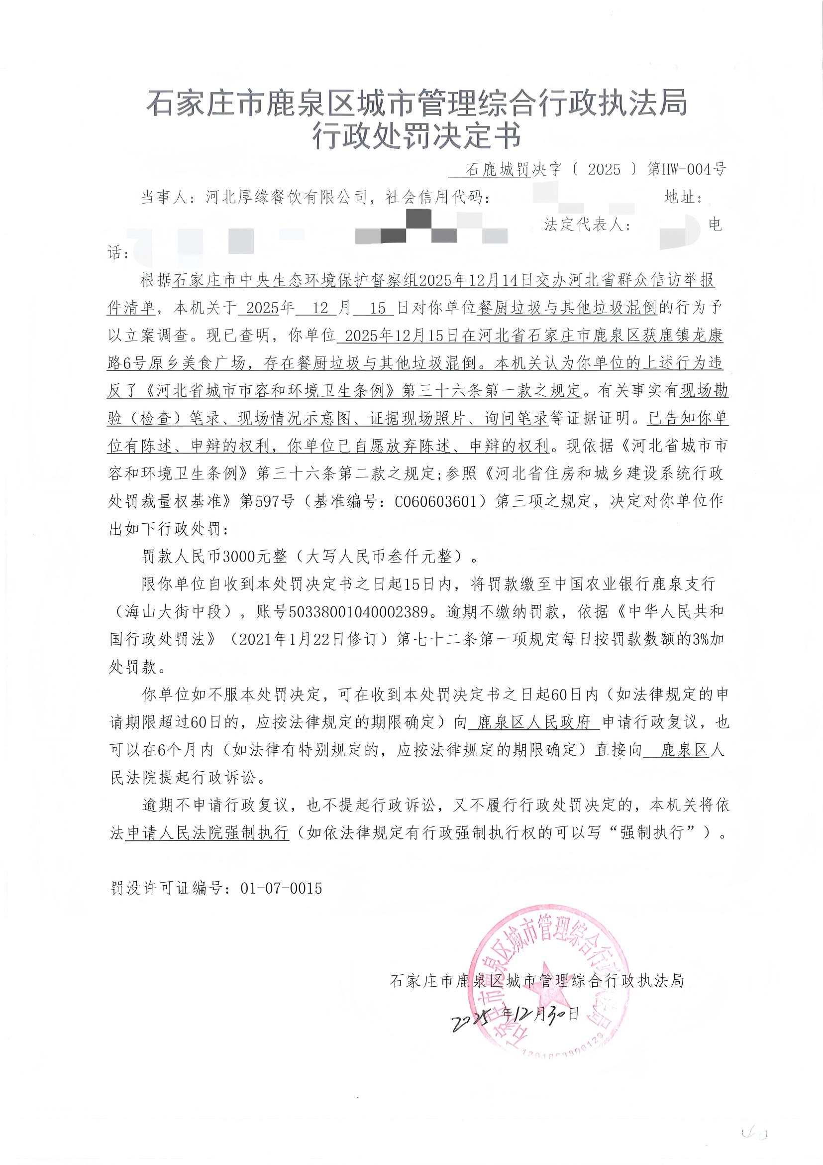 石家庄市鹿泉区城市管理综合行政执法局2025年度行政处罚公示HW-004
