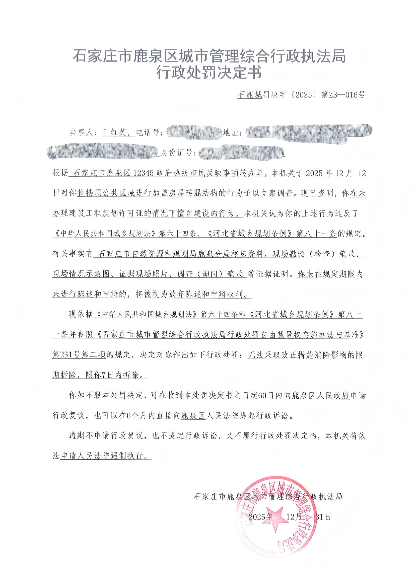 石家庄市鹿泉区城市管理综合行政执法局2025年度行政处罚公示ZB-016