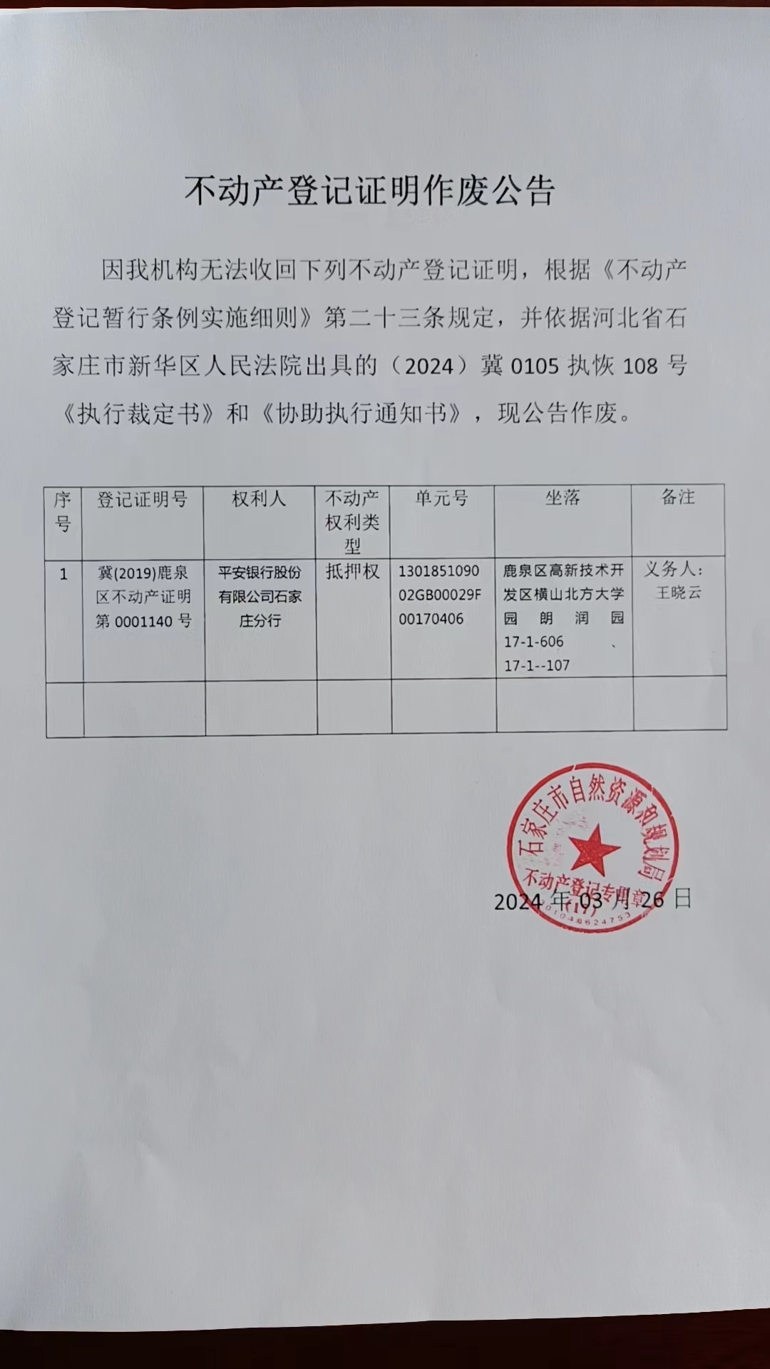 不动产登记证明作废公告(王晓云)