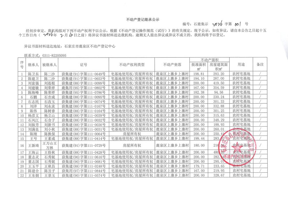 不动产登记继承公示石鹿集示2026字第001号上寨村