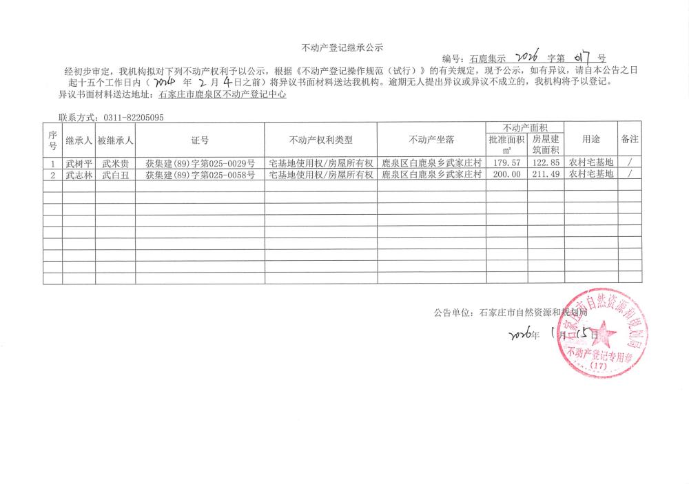 不动产登记继承公示石鹿集示2026字第017号武家庄村