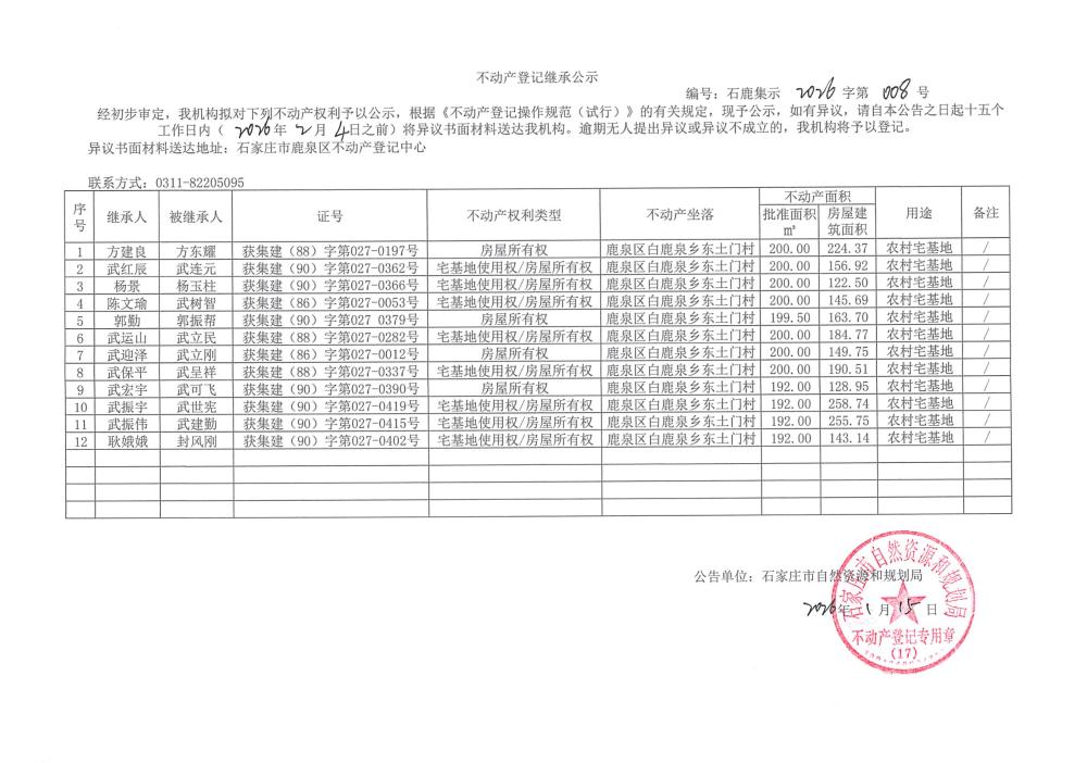 不动产登记继承公示石鹿集示2026字第008号(东土门村)