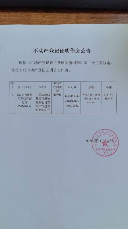 不动产登记证明作废公告(杨雨龙)