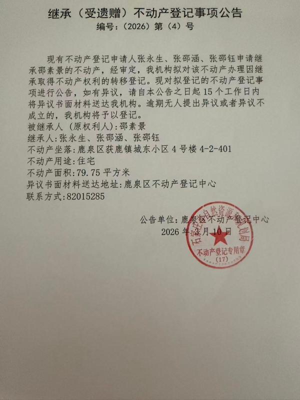 继承(受遗赠)不动产登记事项公告(2026)第(4)号