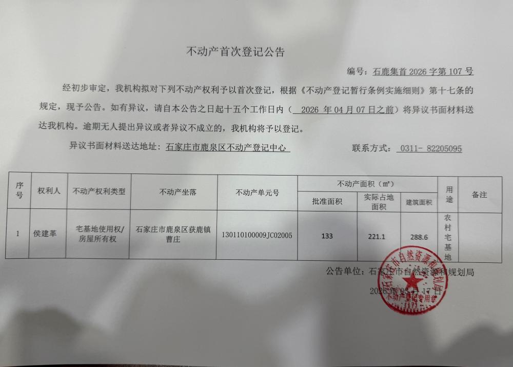 不动产首次登记公告(石鹿集首2026字第107号)